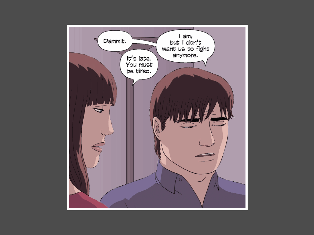 Since these demo pages use layouts that are adapted from layouts originally intended for static print comics, they are artificially constrained and will stop responding to the viewport size when they reach roughly the proportions of a six-by-nine inch printed comics page. But since they are fluid, they avoid the “lateral letterboxing” effect previously discussed and take much better advantage of the viewport when viewed on an iPad, and can properly fill in the space. The difference is subtle, but effective: the lack of a letterboxed zone helps immerse the reader in the comic.